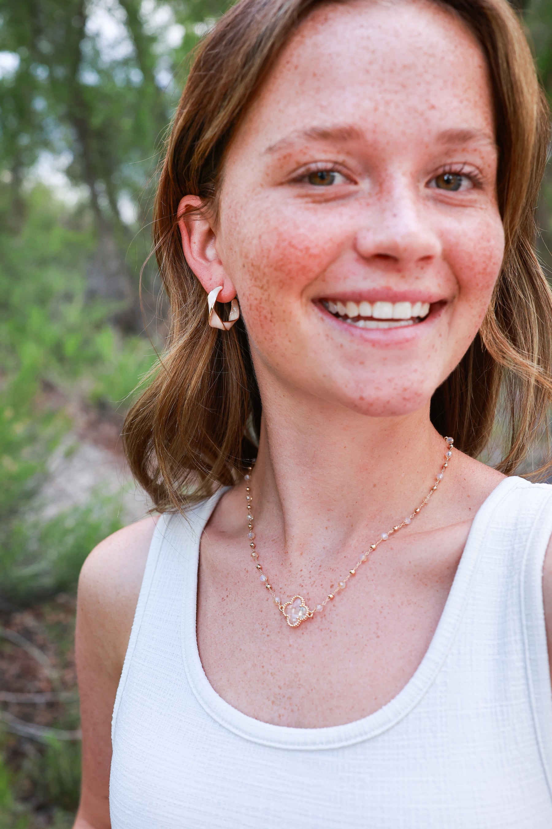 Create the perfect layered look with this elegant fashion necklace. From school to work to date night, this fashion-forward jewelry collection is made for women who love effortless style in the city or small town, downtown or uptown. This beautiful rosary style beaded clover necklace is a versatile everyday piece that complements any outfit. Its delicate design makes a statement on its own, but it also layers beautifully with other chains and pendants. With warm tones of gold, mint and grey, it adds just the right amount of shine and sophistication to your look. Whether you're dressing up a casual tee and your favorite blue jeans or adding a finishing touch to your evening outfit, this necklace brings an elegance that works for any occasion. It also makes a thoughtful gift for birthdays, Mother's Day, Christmas, or Valentine's Day for a stylish thank-you for someone special who loves unique, handcrafted-inspired jewelry.