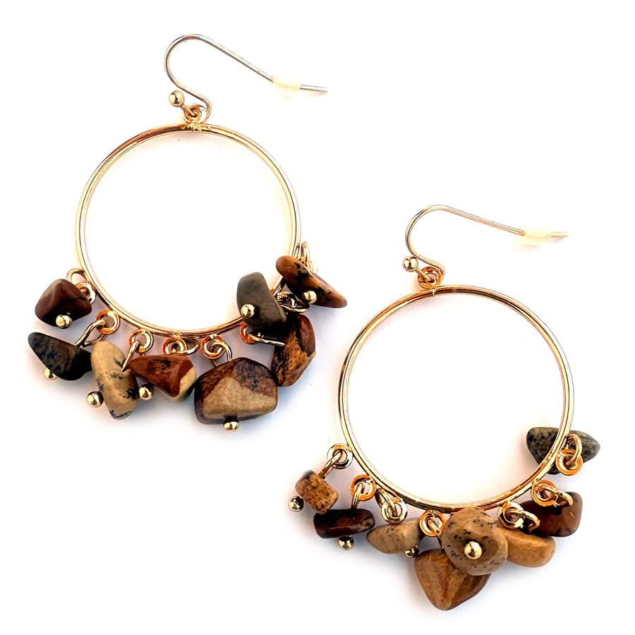 From school drop-off to work to date night, this fashion-forward jewelry collection is made for women who love effortless style with a touch of Boho flair and natural beauty. These ring-style earrings are a perfect everyday accessory lightweight, eye-catching, and full of personality. Each pair features a unique mix of tumbled natural gemstones, artfully arranged on a circular hoop design that brings organic texture and a soft pop of color to your look. Whether you're in your favorite blue jeans and a tee or dressed up for an evening out, these earrings strike a perfect balance between earthy elegance and free-spirited charm. The natural stones vary slightly in color and shape, making each pair one of a kind. They also make a thoughtful gift for birthdays, Mother's Day, Christmas, or Valentine's Day for a stylish thank-you for someone who appreciates handcrafted-inspired, nature-infused jewelry. Crafted with care and designed to move with you, these gemstone ring earrings bring depth, movement, and an effortlessly cool vibe to any outfit, perfect for casual days, office wear, or a night out with friends.